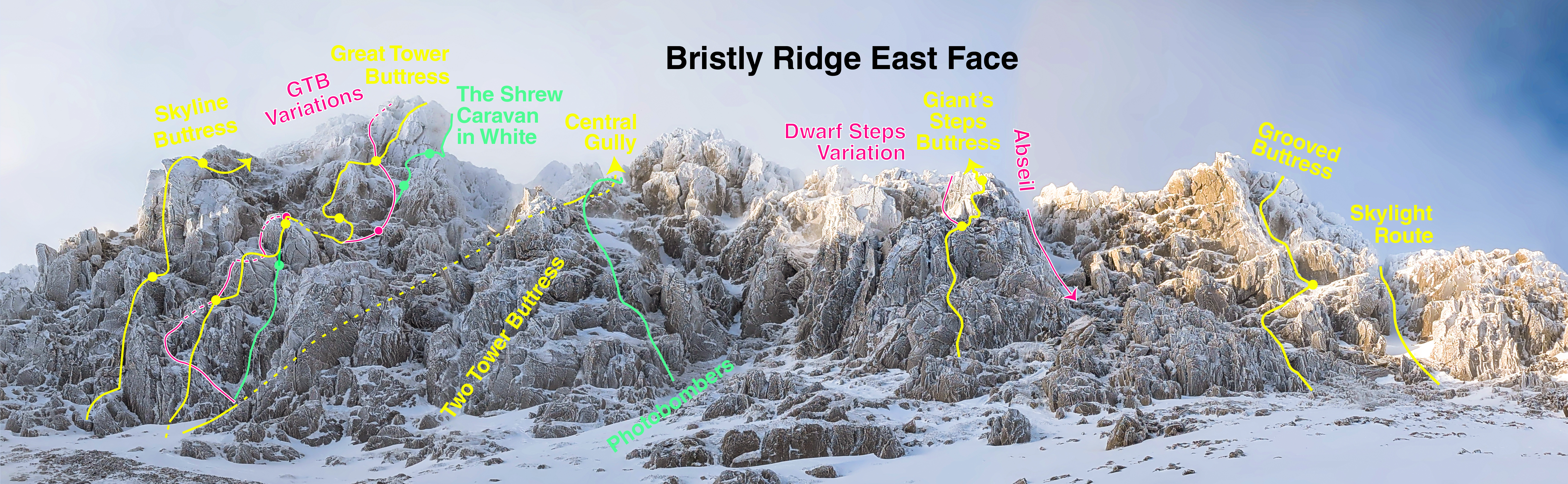 I’ve just drawn the lines of the routes that I’m sure of, and received input from the winter ascent team for Skyline Buttress, Photobombers and The Shrew Caravan in White. I’ve only marked up Great Tower Buttress V, 7 (FWA Lee Roberts, Mark Baggy Richards, Lee Roberts, Stu Stanley Dec 2010) in that area for clarity and marked up some easier variation pitches others have taken around the main difficulties of GTB which can drop the grade down to at least IV,5 maybe even a touch easier. It would be good to establish a line of least resistance with a proper write up for the easiest mountaineering route up this secition. A better topo photo I think would be helpful particularly for this area to establish the lines of Rime and Freezin and Knave Variation.